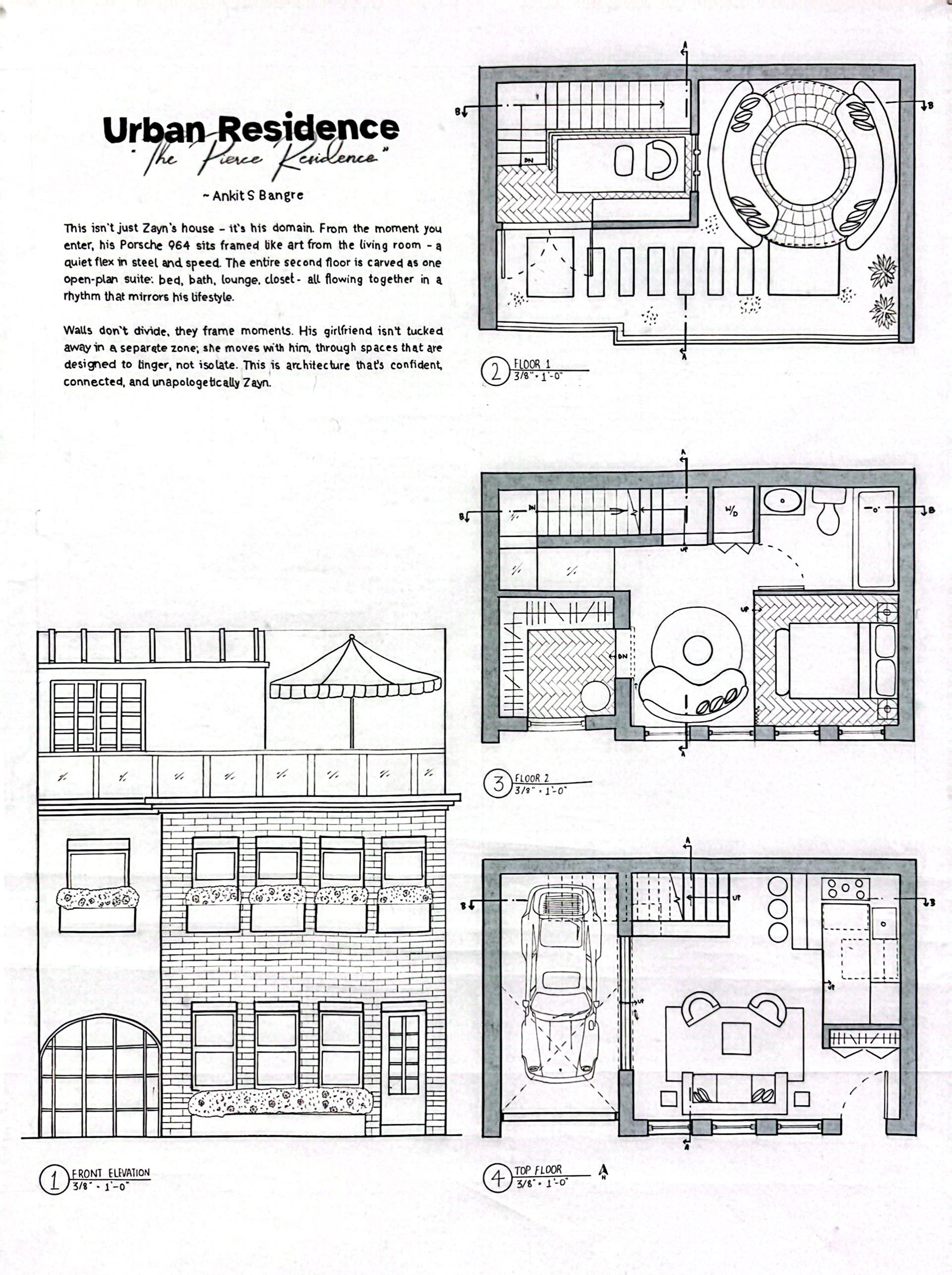 The Pierce Residence is a contextual urban dwelling designed for a Fish-town site, developed through a fully hand-drafted process. Grounded in multiple site visits and neighbourhood research, the project responds to both the physical constraints of the row house typology and the character of its surroundings.