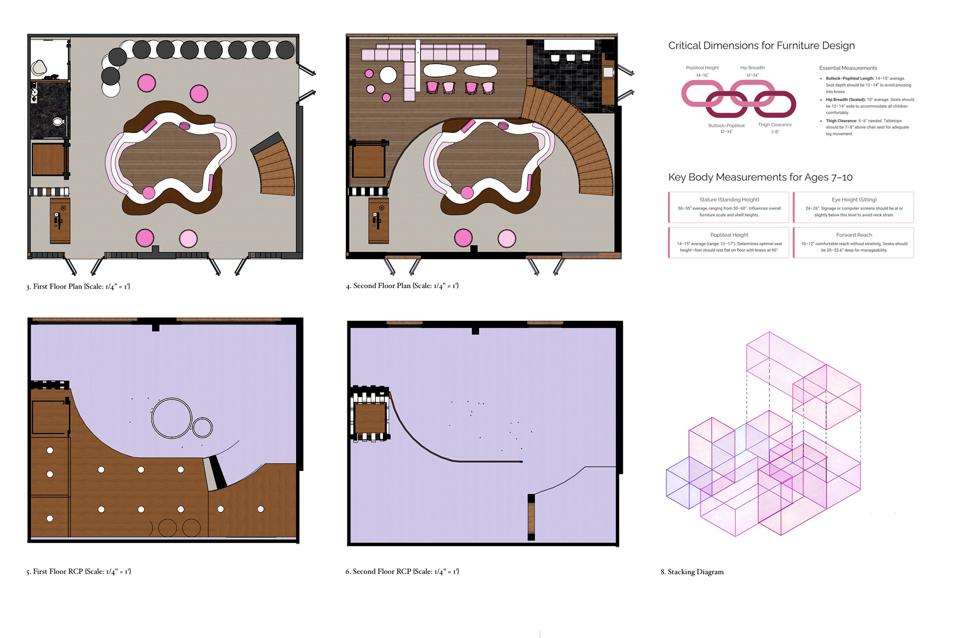Inspired by the malleability of wax, the space embraces gentle transitions and continuous surfaces. Curved geometries guid movement organically, allowing seating, circulation, and activity zones to flow into one another - creating an intuitive and unrestricted environment for children.