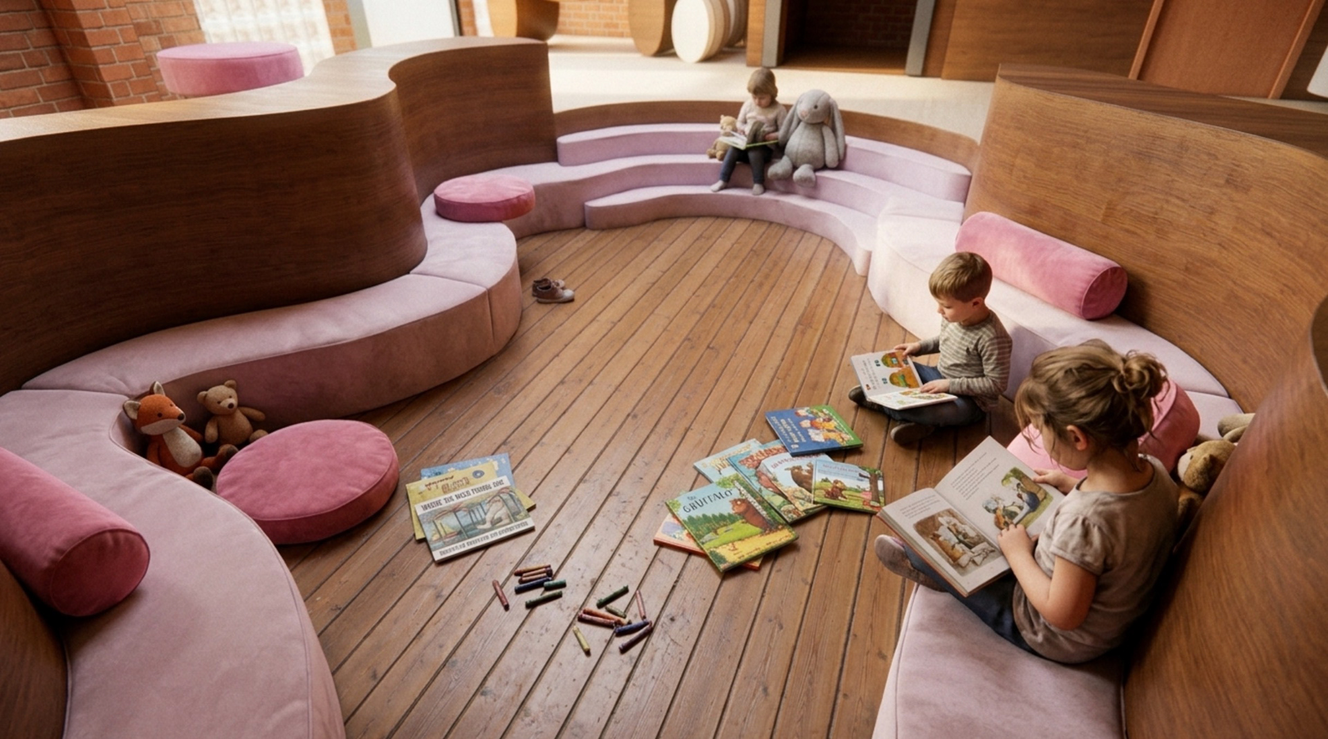 Comfort and safety remain integral to the design. Rounded edges, warm materiality, and integrated seating foster a calm yet engaging atmosphere, while a central feature acts as both a spatial anchor and an interactive element, encouraging connection and movement within the space.