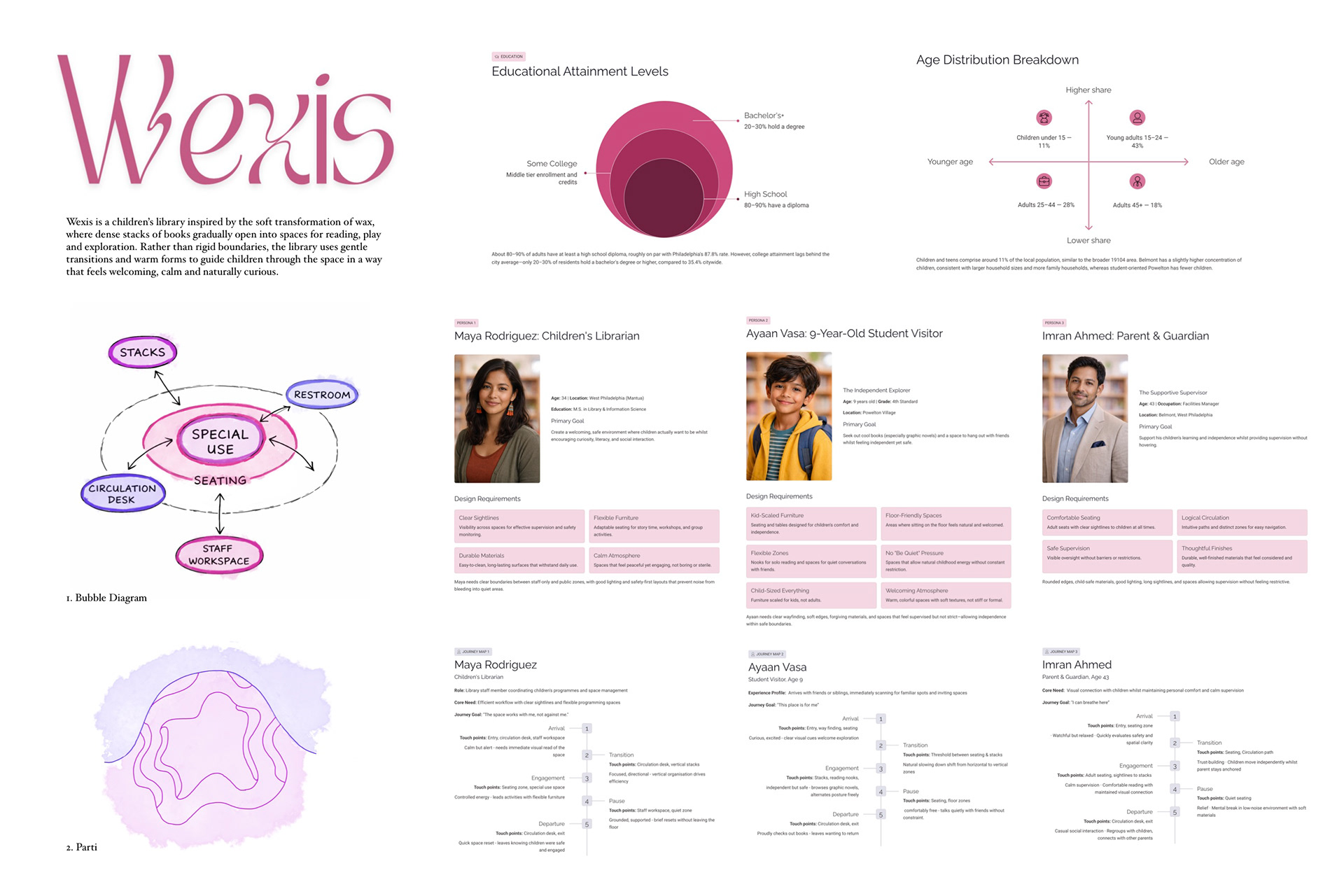 Wexis is a children’s library centred around the idea of softness and transformation. The design challenges the rigidity of traditional bookshelves by reimagining them as fluid, sculptural forms that shape spaces for reading, play and exploration.
